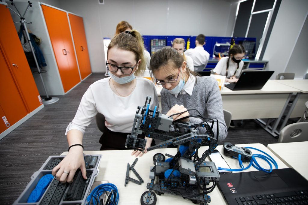 Лаборатория робототехники оснащена профессиональными паяльными станциями для монтажа радиоэлектронных компонентов, зоной для сборки и программирования роботов, а также тренировочным полигоном. Благодаря оборудованию для радиомонтажа, а также размещенным рядом мастерским для механической обработки материалов, обучающиеся могут не только собирать роботов из готовых наборов, но и самостоятельно создавать полностью новые конструкции мобильных или промышленных роботов.