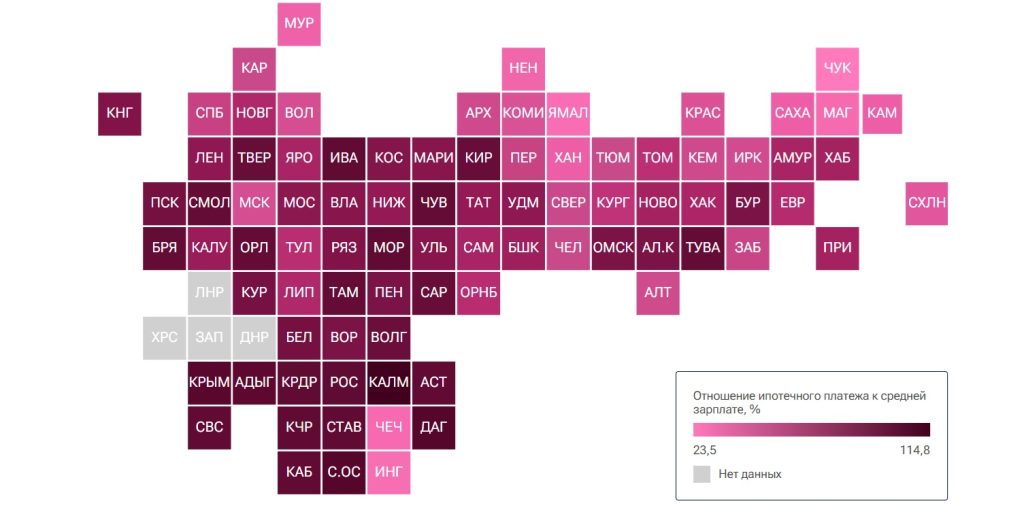 При этом в верхней части рейтинга оказались и две республики Северного Кавказа — Ингушетия и Чечня, занявшие третье и четвертое места соответственно. Однако причина их высоких позиций иная: очень небольшой средний размер ипотечного кредита, который почти в четыре раза меньше среднего по России. Замыкают рейтинг с наименьшей долей платежа Калмыкия и Осетия.
