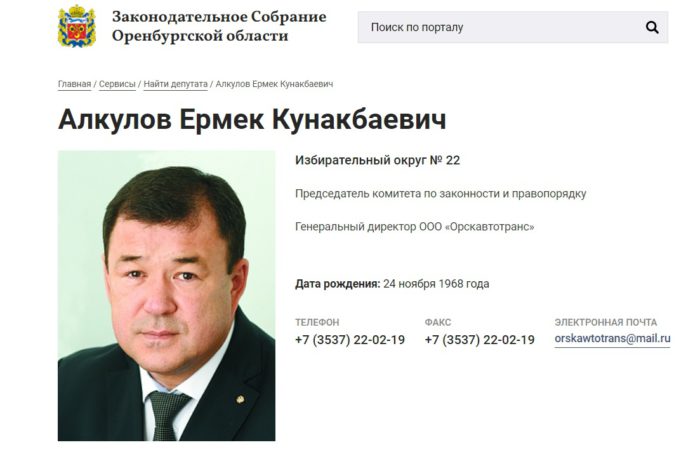 Как отмечают местные СМИ, гендиректор ООО «Орскавтотранс» — экс-депутат Заксобрания, единоросс Ермек Алкулов. В выходные он проиграл выборы на своем округе справедливороссу Вячеславу Ращупкину и не попал в новый созыв областного парламента. Стоит отметить, что в открытых базах директором ООО «Орскавтотранс» значится другой человек, при этом на сайте Заксобрания в профиле Алкулова он числится гендиректором этой компании.