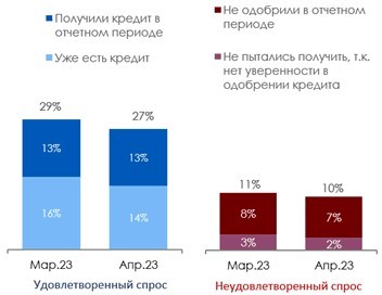 Компонента Кредиты снижается второй месяц подряд. Однако в целом существенного отката к нейтральной зоне не наблюдается, что говорит о том, что доступность финансирования остается высокой. Так, лишь 10% из всех компаний отметили, что не получили одобрение, либо даже не подавали заявку с уверенностью, что не смогут получить его. Доля удовлетворенного спроса снизилась за месяц на 2 п.п., до 27%, что является минимумом с декабря. Изменения доступности банковского кредита в компаниях МСП