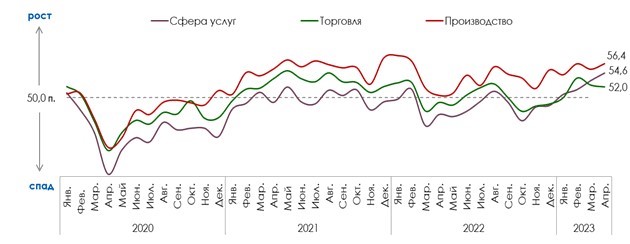 Деловая активность в сфере услуг выросла на 1,4 п.п. до отметки 54,6. В сфере услуг основными драйверами подындекса были улучшение фактических продаж и доступности кредитования.
