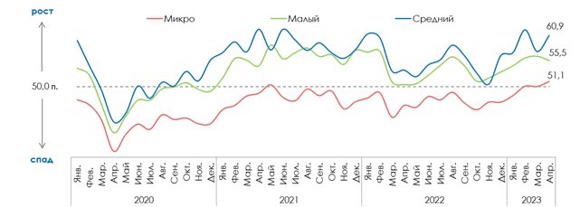 В апреле активизация деловой активности была отмечена в сегменте среднего и микробизнеса. Малый бизнес немного ослабил темпы роста.