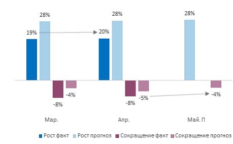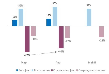 Фактический показатель увеличения штата говорит о том, что 12% МСБ нанимали новых сотрудников, что сопоставимо с данными за прошлый месяц. Вместе с тем, доля компаний, фактически увеличивших штат, осталась на 7 п.п. ниже доли тех, кто сокращал персонал.