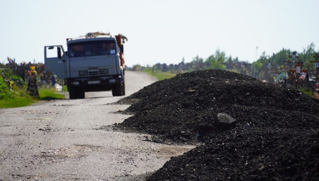 Отходы после ремонта дороги на проспекте Дзержинского привезли на территорию кладбищенского комплекса «Степной». Асфальтовый срез разравнивают и утрамбовывают. Такого покрытия достаточно для дорог с низкой интенсивностью движения, поясняют эксперты.