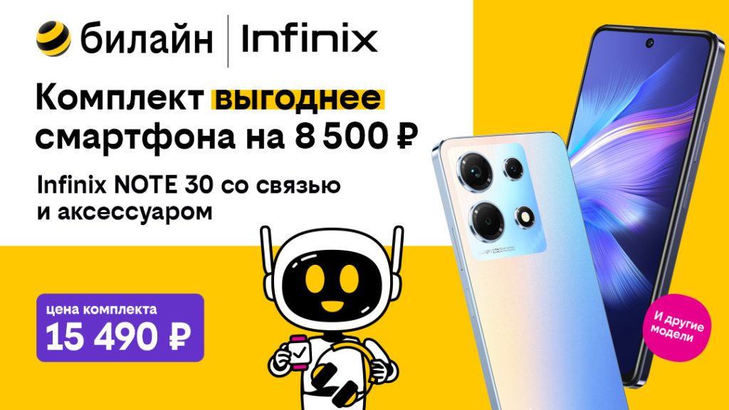Одним из самых интересные предложений акции является Infinix Note 30, он оснащен аккумулятором емкостью 5000 мАч с поддержкой быстрой зарядки, а также обладает 6,78-дюймовым безрамочным дисплеем с разрешением 2460×1080 пикселей и 64-мегапиксельной камерами. Стоимость комплекта с Infinix Note 30 составит 15 490 руб, что на 8 500 руб. выгоднее, чем покупка этого же смартфона.