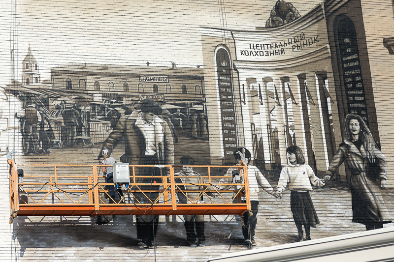 Почти месяц художник-монументалист Анна Дрыгнова работает над гигантской картиной, посвященной истории Центрального рынка Оренбурга. В этом году ему исполняется 140 лет. На стене одного из зданий рынка на площади около 180 квадратных метров, на перекрестке улиц Володарского и 8 марта, появилась огромная ретрофотография, рассказывающая об истории рынка.