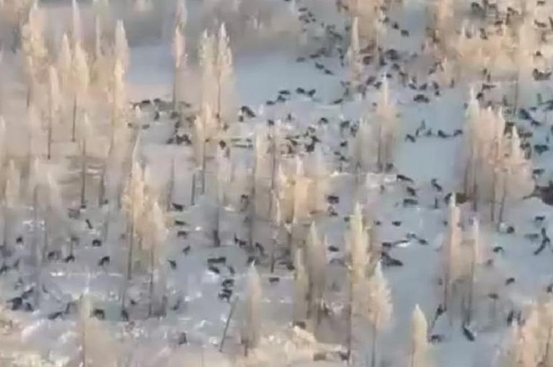 В социальных сетях пользователи опубликовали сообщения ЕДДС с предупреждением об опасности и любительское видео, на котором большое количество животных, идущих по лесу, запечатлено сверху. На записи невозможно определить географию местности.