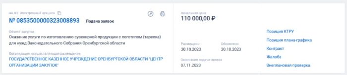 В другом лоте речь идет о шариковых ручках также с логотипом Заксобрания Оренбуржья. Заказчик нуждается в 200 ручках со сменным стержнем. Продукция должна быть серого цвета с золотистыми или серебристыми декоративными элементами. На корпусе ручек должна быть надпись «Законодательное Собрание Оренбургской области 30 лет». Стартовая цена этого контракта – 50 тысяч рублей. Итоги аукциона подведут 8 ноября.
