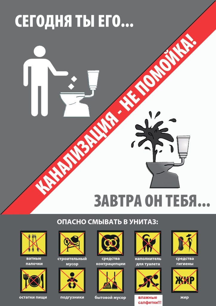 Уважаемые оренбуржцы, соблюдайте правила пользования городской канализацией! Не выбрасывайте в нее бытовой и строительный мусор, а также любые другие биологически неразлагаемые предметы. Не сливайте пищевые отходы, так как жир оседает на поверхность труб. Следите, пожалуйста, за детьми, чтобы они не кидали в унитаз игрушки и мелкие предметы. Уважайте чужой труд и живущих рядом с вами людей.