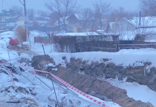 Из-за обрушения траншеи произошел обрыв трубы. Вода размывает грунт дальше, а в нескольких метрах от огромной ямы находятся жилые дома по улице 19 квартал. Местные жители бьют тревогу. Они волнуются, что постройки могут буквальной уйти под землю.