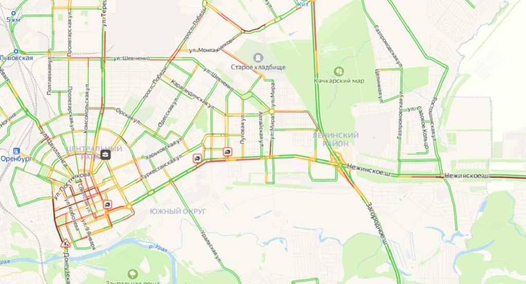 По данным сервера Яндекс.Пробки в Оренбурге самые большие проблемы по состоянию на 18:15 — на улице Чичерина в направлении моста через Урал и проезде Северном в направлении кольца на Загородном шоссе.
