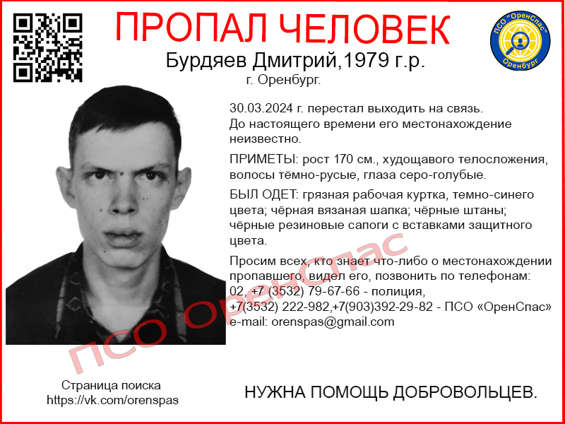 Всех, кто что-либо знает что-либо о местонахождении пропавшего или видел его, просят позвонить по телефонам: 02, +7 (3532) 79-67-66 — полиция, +7(3532) 222-982,+7(903)392-29-82 — ПСО «ОренСпас».