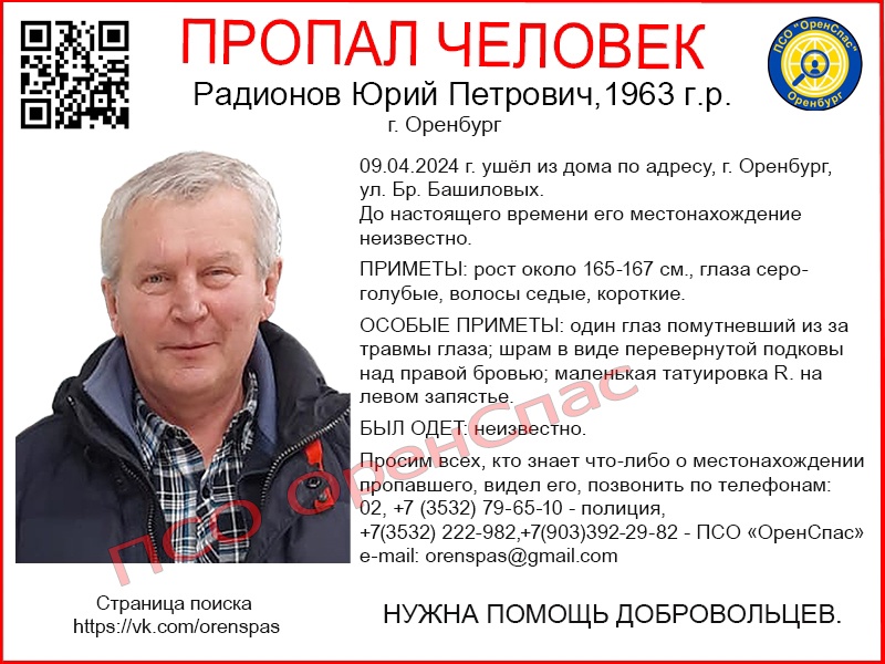 Всех, кто что-либо знает о местонахождении пропавшего или видел его, просят позвонить по телефонам: 02, +7 (3532) 79-65-10 — полиция, +7(3532) 222-982,+7(903)392-29-82 — ПСО «ОренСпас».
