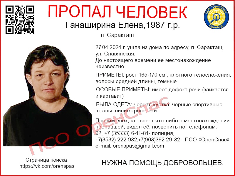 Женщина 1987 года рождения пропала 27 апреля 2024 года. Оренбурженка ушла из дома по улице Славянской Саракташа и не вернулась. До настоящего времени её местонахождение неизвестно.