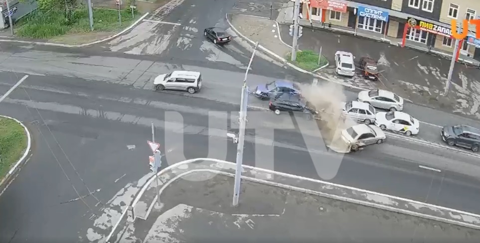 На опубликованной в телеграм-канале UTV записи видно, как один из автомобилей при выезде с улицы Леушинской проигнорировал красный свет светофора и на высокой скорости врезался в другую машину, которую, в свою очередь, отбросило на транспортные средства в соседнем ряду.