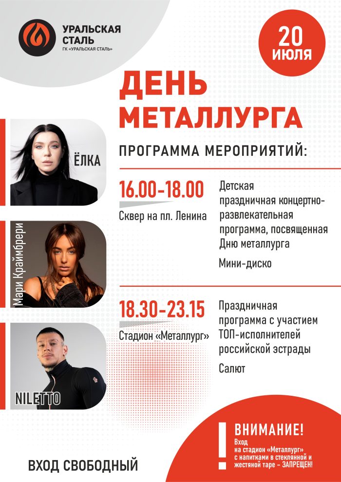 В субботу 20 июля с 16:00 до 18.00 в сквере на площади Ленина пройдет праздничная детская концертно-развлекательная программа с участием творческого коллектива продюсерского центра «Нота», аниматоров, проведением конкурсов, викторин и мастер-классов, а также танцевальное Мини-диско от Уральской Стали. В этот день кульминационным событием празднования станет поздравление металлургов руководителями области, города и Уральской Стали на стадионе «Металлург». Мероприятие начнется в 18.30 и продолжится Парадом звезд российской эстрады. Для новотройчан и гостей города выступят: московская кавер-группа UNIVERSAL, Ёлка, Мари Краймбрери и Niletto. В 23.15 программа закончится красочным салютом.
