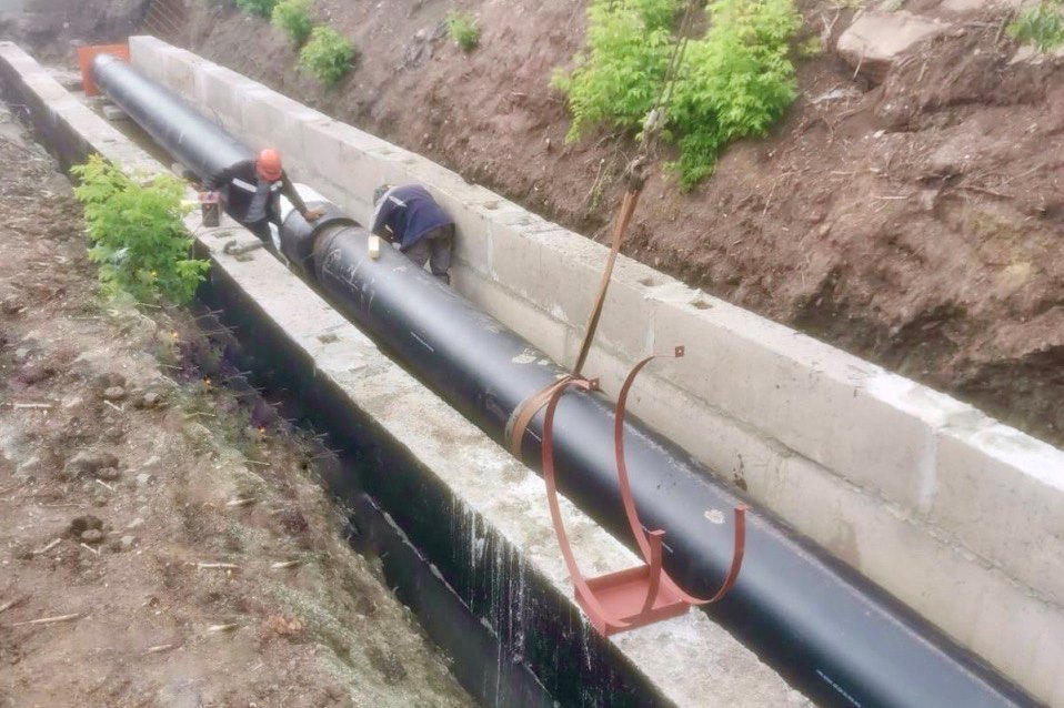 На текущий момент уже выполнены земляные работы, демонтаж изношенных коммуникаций, смонтирован железобетонный канал для последующей прокладки трубопровода. Все мероприятия повысят качество и надежность теплоснабжения в городе.