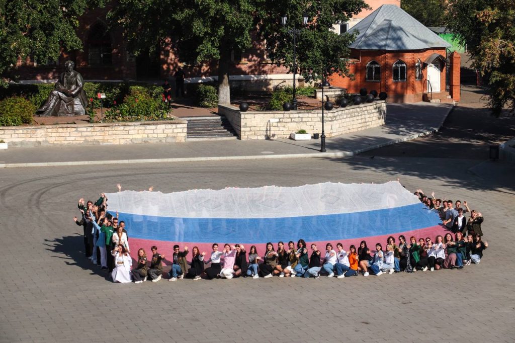 Активисты студенческих отрядов и студенты Оренбургского государственного аграрного университета развернули самый большой пуховый платок на площади перед музеем истории города.