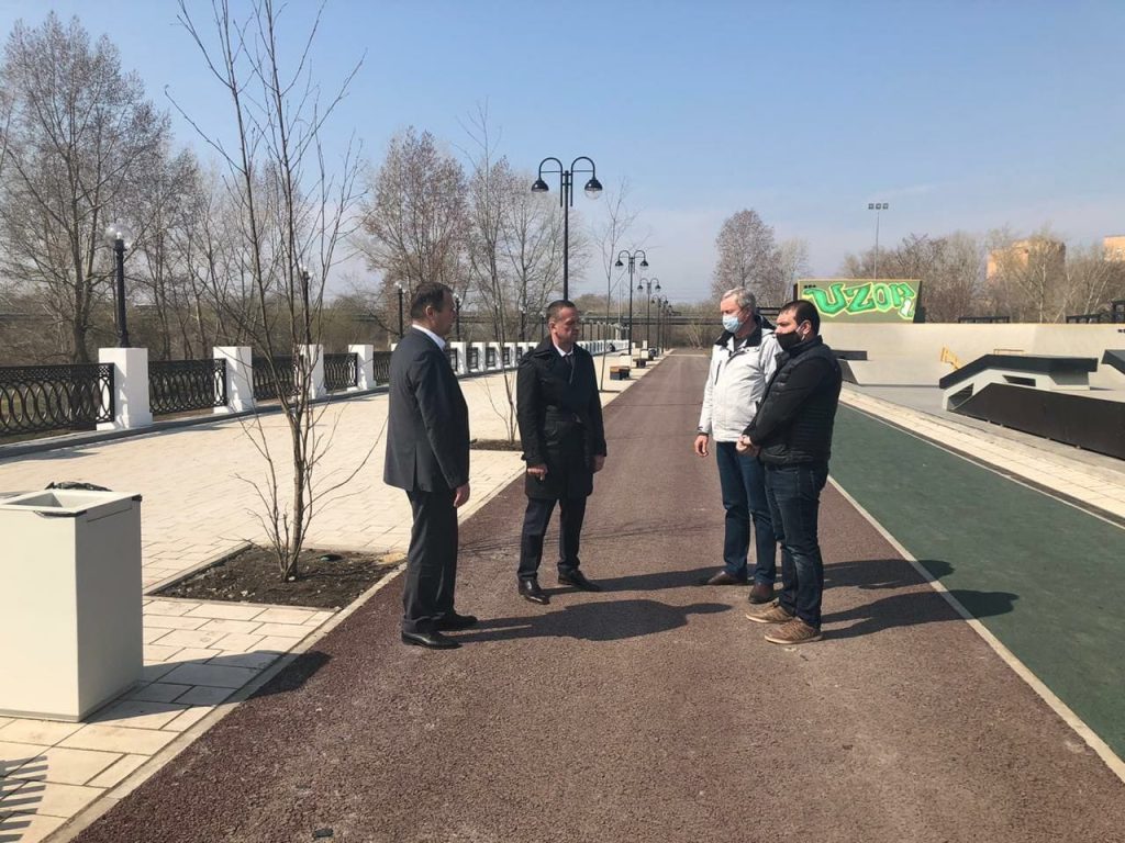 Владимир Ильиных осмотрел скейт-площадку, детскую игровую зону, беговые дорожки. Здесь глава города отметил некоторые замечания по состоянию резинового покрытия, которое было повреждено во время уборки снега. Они будут устранены при наступлении постоянной температуры выше +12, как того требует технология укладки покрытия.
