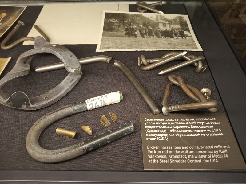 Специально для оренбургской галереи многократный призер международных соревнований по сгибанию стали (в США) Иван Ванькович из Выборга завязал толстенный стальной прут по образцу, известному по британским фотографиям Александра Засса 1930-х годов.