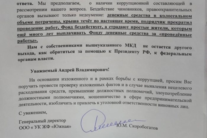 В заявлении также говорится о совершенном подлоге сотрудниками ООО «ТрансСтройСервис», в результате которого была мошенническим путем получена подпись генерального директора ООО УКЖФ «Южная» Скоробогатова. В рабочую документацию был умышленно вставлен один лист, который впоследствии использовали при формировании акта приема-передачи кровли по завершению ремонта в одном единственном экземпляре (должно быть три). Юрий Скоробогатов, по его словам, никогда не принимал кровлю после проведения капитального ремонта.