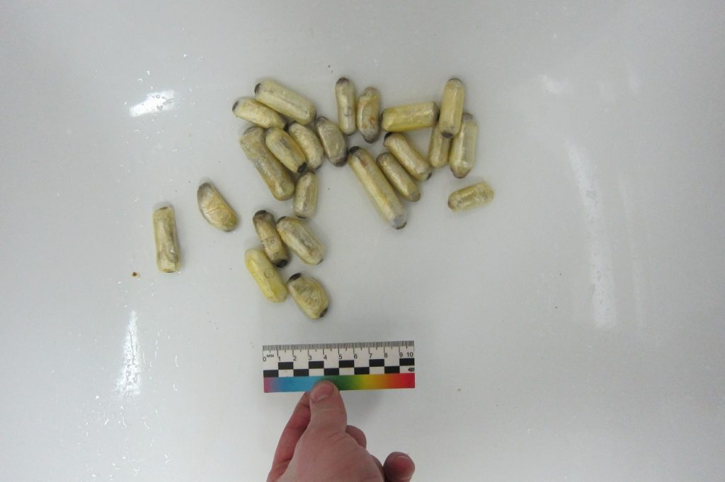 Выяснилось, что молодые мужчины в возрасте 20 и 21 года, уроженцы Тывы, перевозили в желудочно-кишечных трактах партию наркотиков. У них изъяли 24 и 23 полимерных свертка, внутри которых находились гашиш общим весом более 170 граммов.