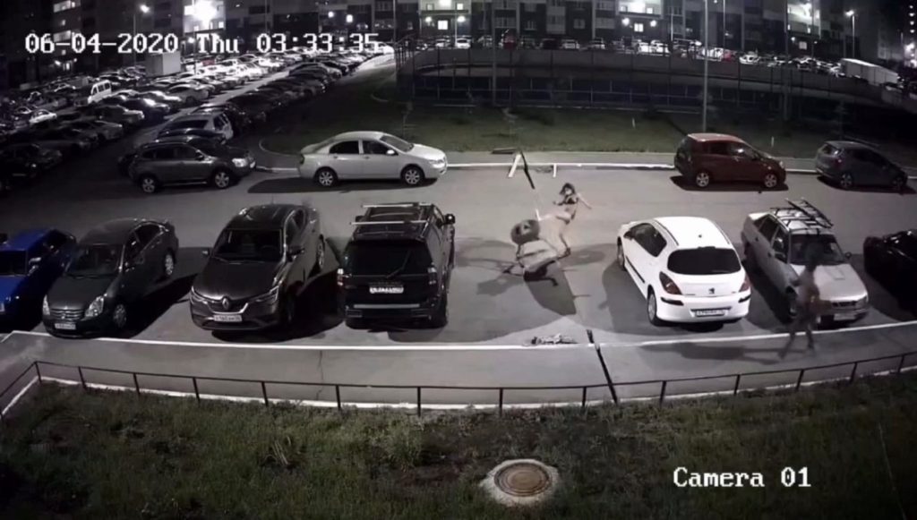Сначала девушка залезла на припаркованный автомобиль и начала прыгать на нём. Затем, облегчившись посреди двора и пнув треногу на парковке, попыталась сорвать камеру наблюдения на подъезде. Похулиганив во дворе, молодые люди поднимаются на лифте в квартиру.