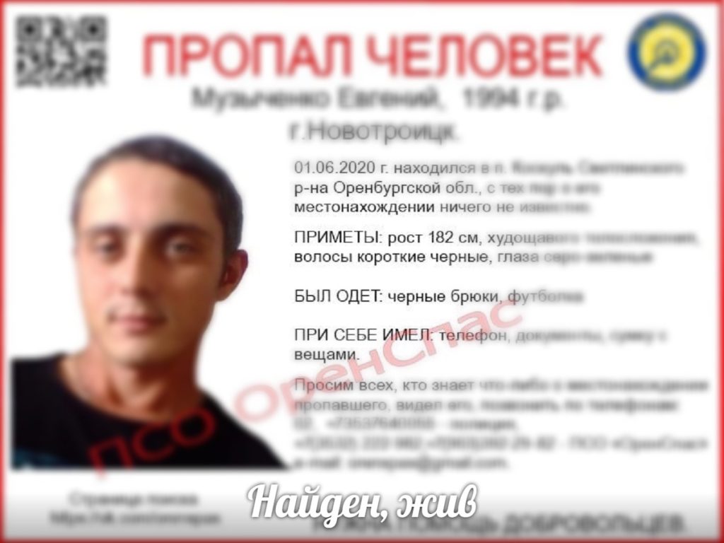 Напомним, Евгений Музыченко пропал в начале лета. 1 июня он находился в посёлке Коскуль Светлинского района Оренбургской области. Он перестал выходить на связь с родными, они подали заявление на розыск в полицию и обратились к поисковикам.