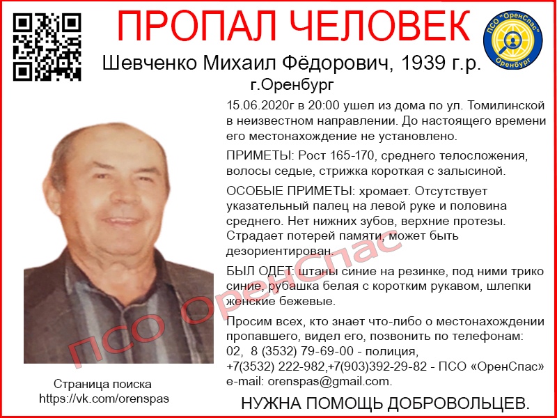 Всех, кто что-либо знает о местонахождении Михаила Шевченко или видел его, просят позвонить по телефонам: 02, 8 (3532) 79-69-00 — полиция, +7(3532) 222-982,+7(903)392-29-82 — ПСО «ОренСпас» e-mail: orenspas@gmail.com.