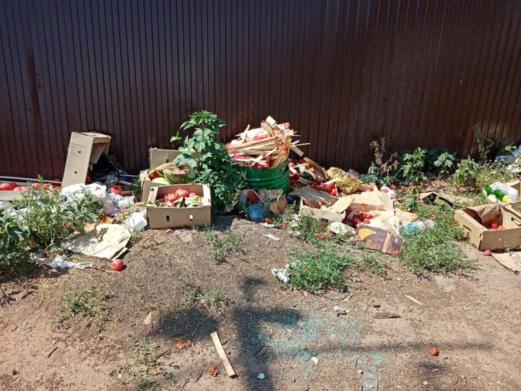 На улице Лесозащитной напротив рынка «Петровский» припаркованные грузовики перемежаются с брошенными коробками и ящиками. На жаре оставили битые арбузы, фрукты и прочие отходы продажи, потерявшие товарный вид. За несколько дней на месте стихийной торговли образовалась стихийная свалка.