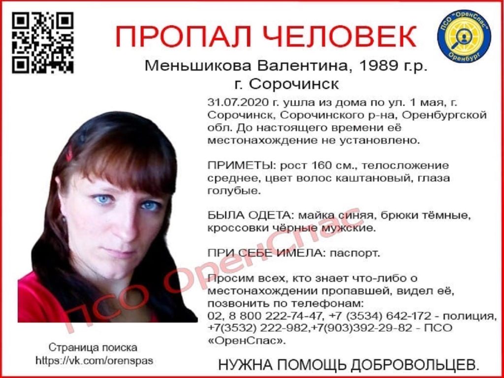 Жительница Сорочинска 1989 года рождения пропала 31 июля 2020 года. Она ушла из дома по улице 1 Мая в Сорочинске и до настоящего времени её местонахождение не известно.