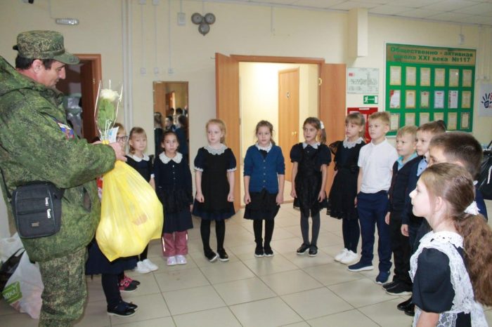 В Оренбургской области участник спецоперации из Сорочинского городского округа пришёл в гости к первоклашкам школы № 117.