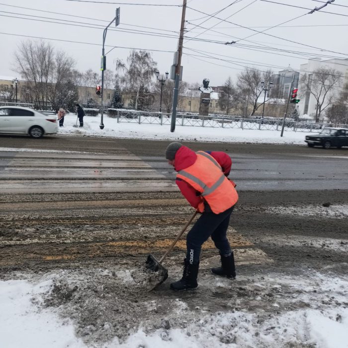 Коммунальщики вручную чистят от снега тротуары, остановки, пешеходные переходы и подходы к ним, проводят противогололедную обработку улиц Володарского, Богдана Хмельницкого, Маршала Жукова и других.