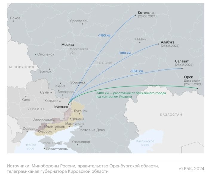 Как пишет РБК, ранее наиболее далеким от границы с Украиной были инциденты в Салавате (Башкирия, 1320 километров от границы) и Новоорском районе Оренбуржья (1480 километров). Ясный расположен более чем в 1500 километрах к востоку от украинской границы. Речь идет об официально подтвержденных инцидентах с беспилотниками и объявленных властями воздушных тревогах.