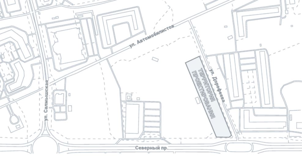 Проектируемый участок представляет собой территорию, расположенную вдоль улицы Дорофеева и Северного проезда, вписанную в сложившуюся окружающую городскую застройку из жилых комплексов, Храма Преподобного Аристоклия Афонского, торгового центра, продуктового рынка и спортивных комплексов.