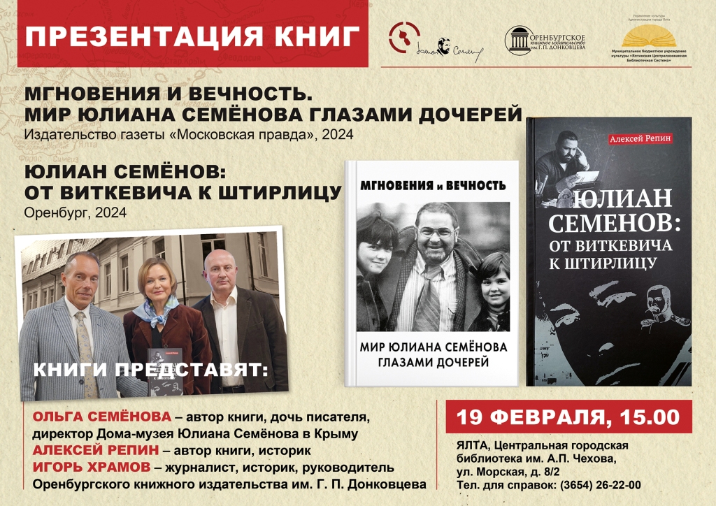 Фундаментальную биографию «Юлиан Семенов: от Виткевича к Штирлицу» Оренбургского книжного издательства им. Г.П. Донковцева и книгу воспоминаний «Мгновения и вечность. Мир Юлиана Семенова глазами дочерей» издательства газеты «Московская правда» представит дочь писателя Ольга Семенова.