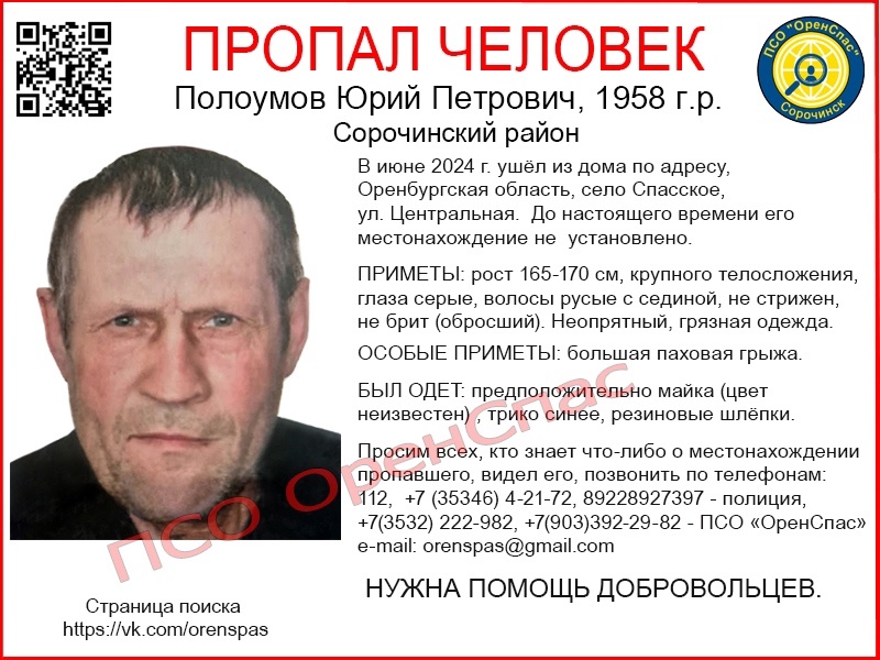Юрий Полоумов 1958 года рождения в июне 2024 года ушёл из дома по улице Центральной села Спасское Сорочинского округа и не вернулся. До настоящего времени его местонахождение не установлено.