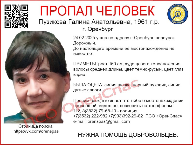 Всех, кто что-либо знает о местонахождении пропавшей или видел ее, просят позвонить по телефонам: 112, 8(3532) 79-65-10 — полиция, +7(3532) 222-982, +7(903)392-29-82 ПСО «ОренСпас».
