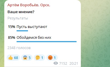 Насколько уместно выступление, в одном из ресторанов нашего города, двух вышедших в тираж комиков из команды КВН «Уездный город», отметившихся распространением недостоверной информации о СВО? Мое личное мнение — абсолютно неуместно! Хочу услышать ваше мнение, — написал Артем Воробьев.