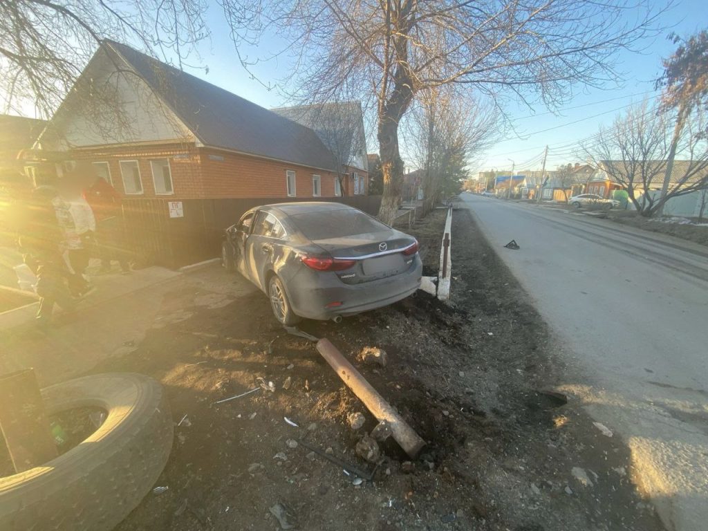 От удара Mazda съехала с дороги, врезалась в столб и забор частного жилого дома. Транспортные средства получили серьезные механические повреждения.