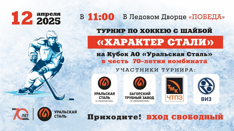 Торжественное открытие состоится 12 апреля в 11:00 на площадке Ледового дворца «Победа». Между собой сыграют команды новотроицких металлургов «Уральская Сталь», подмосковных трубопрокатчиков «ЗТЗ», челябинских «ЧТПЗ» и екатеринбургских «ВИЗ». Хоккеистам предстоит сыграть друг с другом в ходе четырех поединков.
