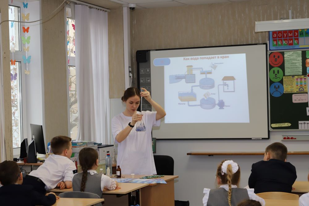 На наглядных примерах, с помощью химических опытов, ребята увидели, как специалисты компании проверяют качество воды, прежде чем она попадает в кран. Отдельное внимание на уроке уделили заботе об экологии и сбережении водных ресурсов.