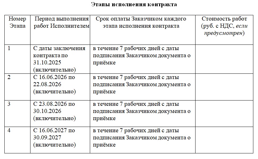 Сроки исполнения контракта – с 2025 года по 2027 год. Работы разбиты на несколько этапов. Они стартуют с момент подписания контракта и до 30 сентября 2027 года.