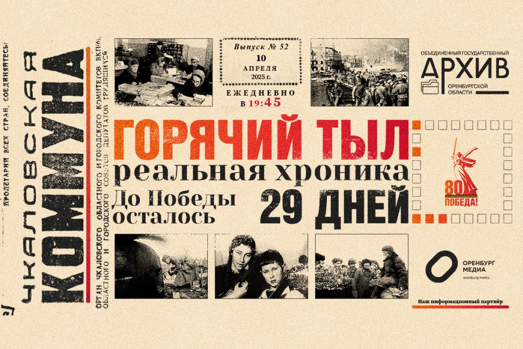 Проект «Горячий тыл: реальная хроника» подготовлен архивной службой Оренбургской области и посвящен 80-летию Победы в Великой Отечественной войне. Оренбург Медиа — информационный партнер проекта.