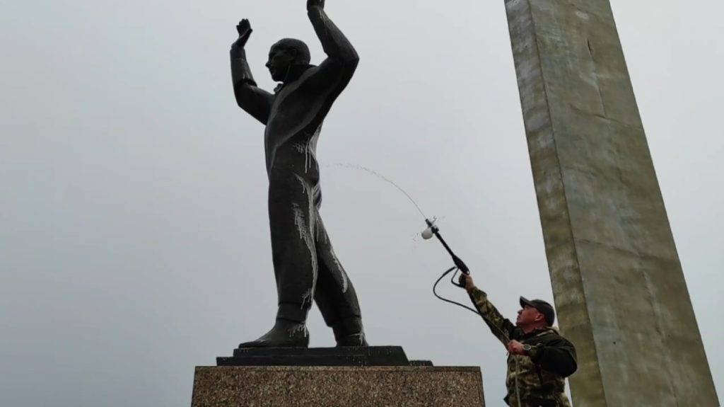 Специалисты коммунальных служб тщательно обработали скульптуру и постамент специальным очищающим составом, после чего смыли его чистой водой. Такая технология позволяет бережно удалить зимние загрязнения, не повреждая материалы памятника.