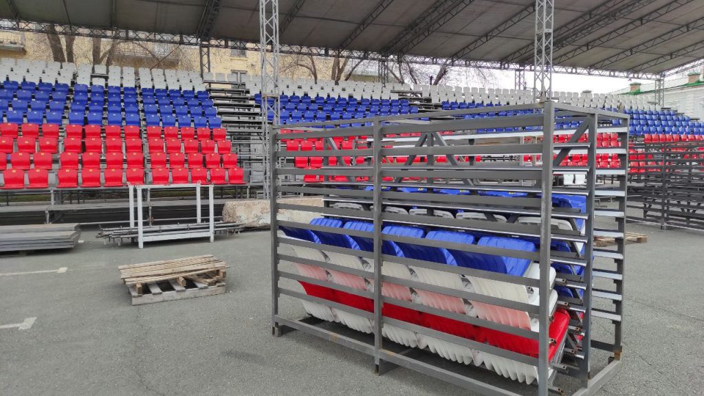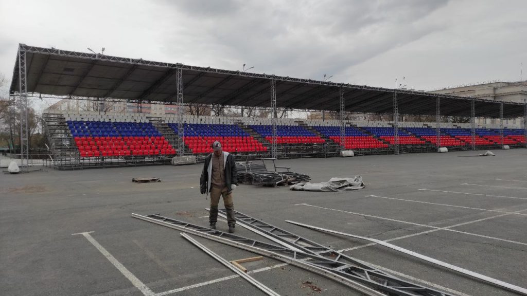 В центре Оренбурга завершают сидений трибун. В ближайшее время приступят к сборке 100-метровой стены.