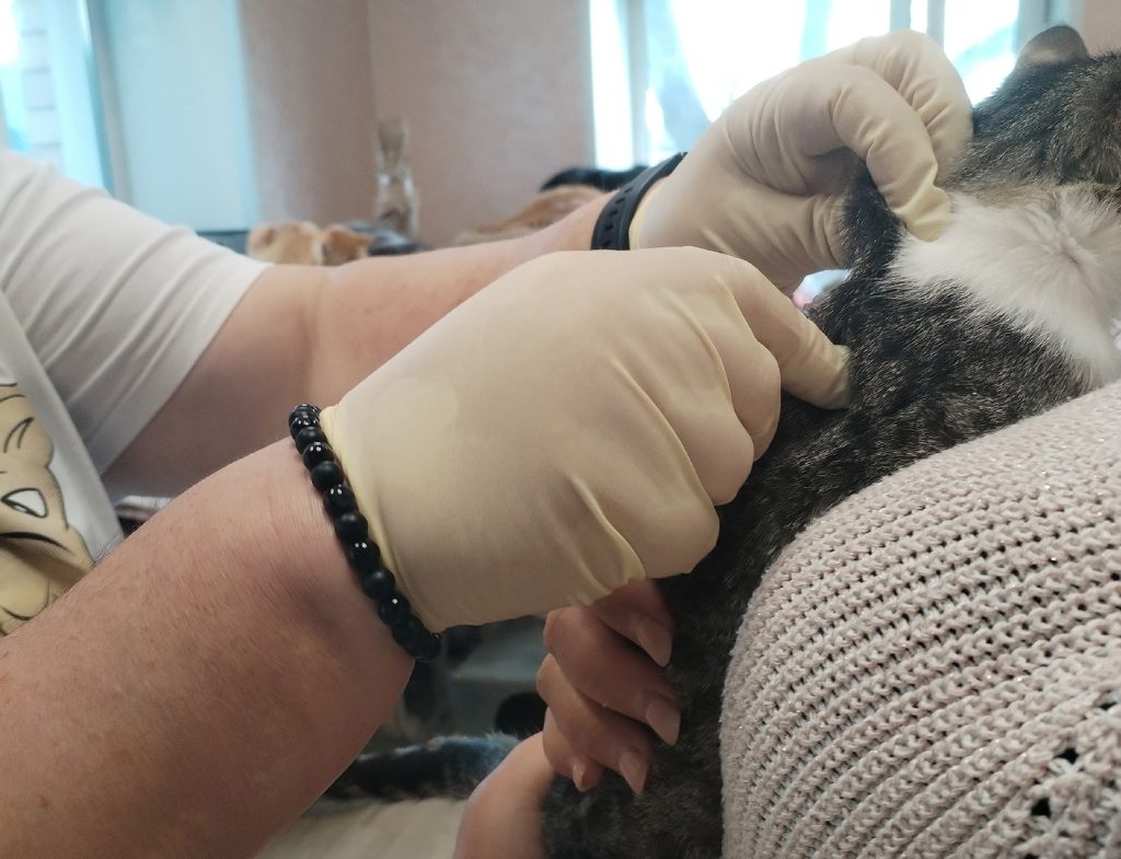 Ранее всех животных приюта обработали от клещей. Этой весной ветеринарная клиника «ДокВет» и Свято-Троицкий благотворительный фонд они полностью взяли на себя обработку хвостиков от паразитов.