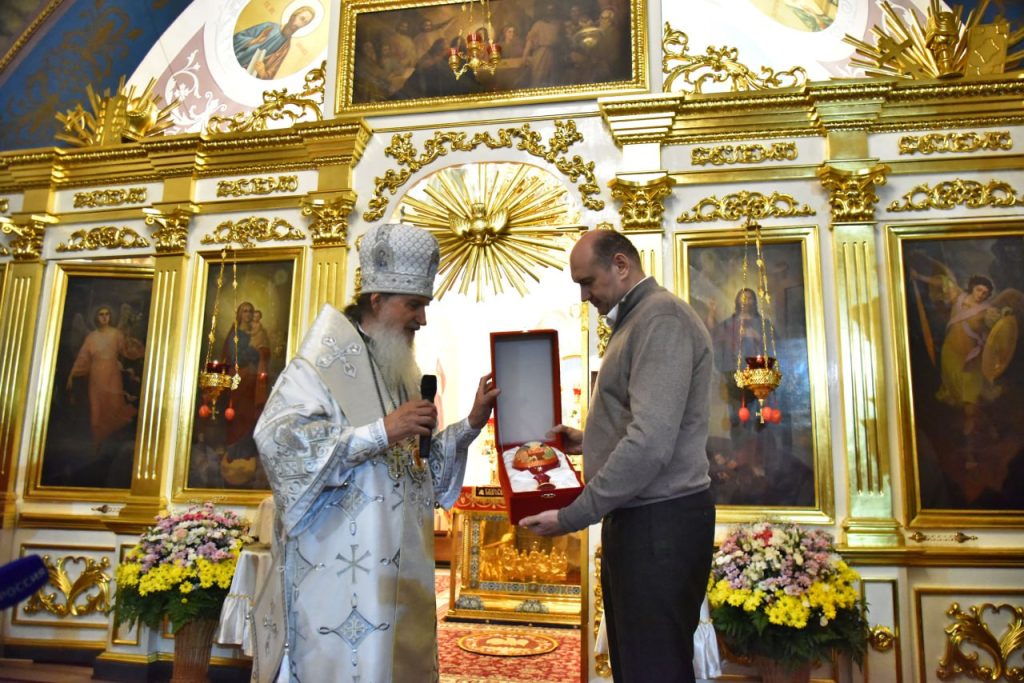 По завершении пасхальной заутрени митрополит Петр вместе с Евгенией Солнцевым обменялись подарками. Владыка подарил главе региона пасхальное яйцо с образом Воскресшего Христа. В ответ Евгений Солнцев преподнес оренбургский каравай.