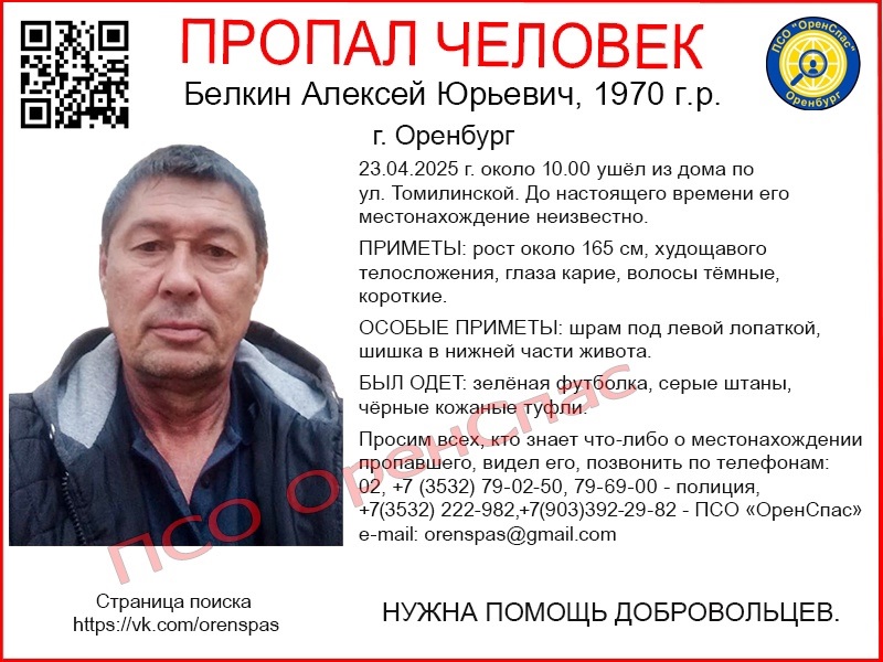 Мужчину разыскивают волонтеры и полиция. Всех, кто знает о его местонахождении, просят сообщить в полицию или отряд «Оренспас».