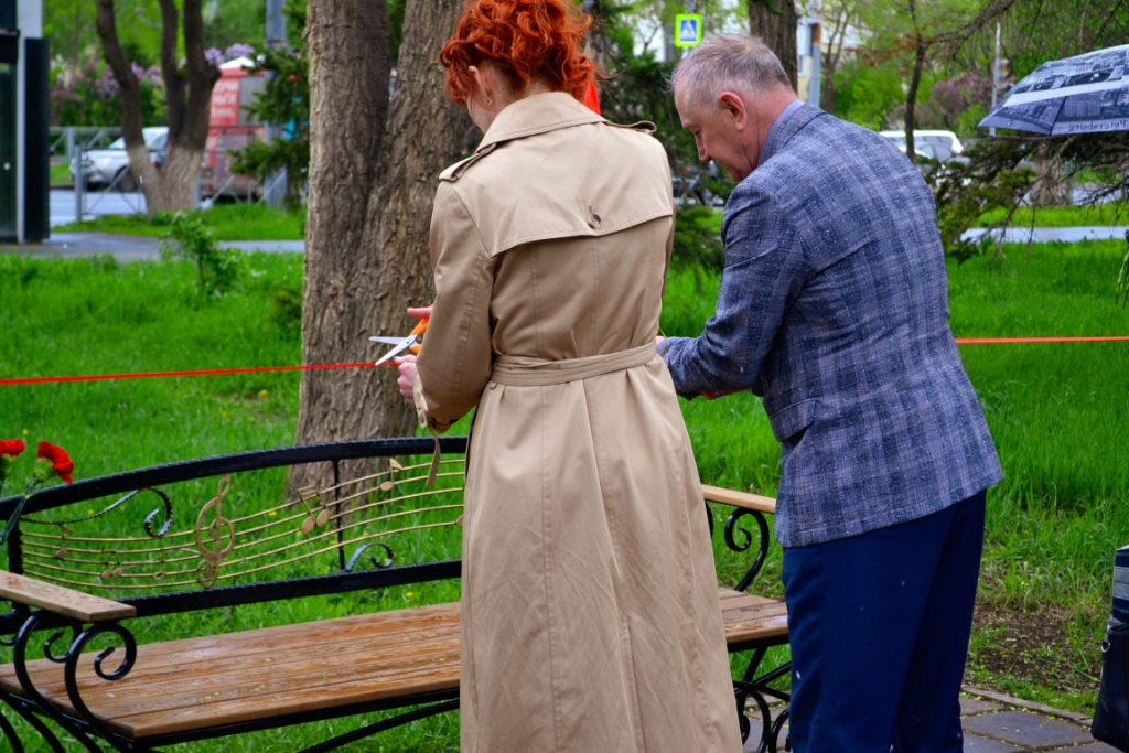 Около смонтированной музыкальной скамейки расположена специальная опора, на которой закреплена звуковая колонка, проигрывающая песни военных лет. Датчик движения фиксирует момент, когда человек садится на скамейку и активирует работу аудиосиситемы.